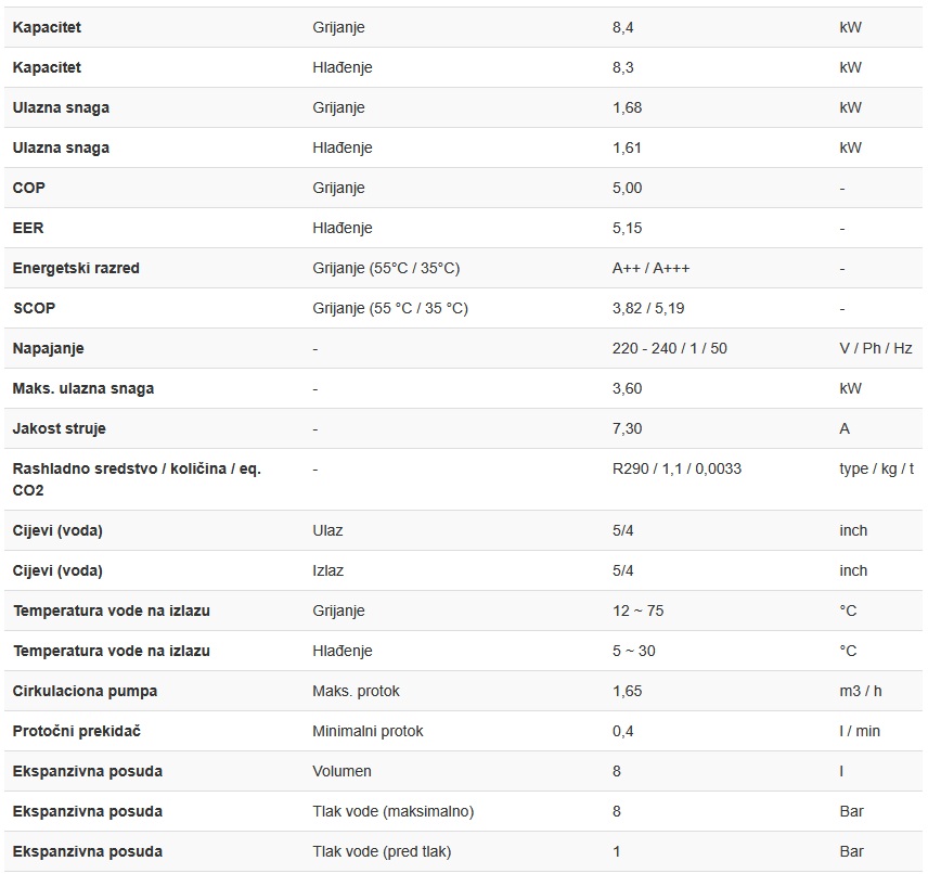 Osnovne karakteristike dizalice topline Sinclair SMHM-80P/3: